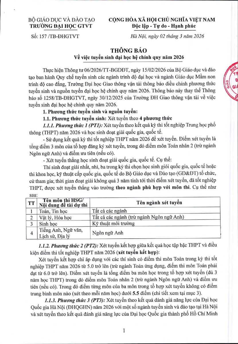 THÔNG BÁO TUYỂN SINH HỆ ĐẠI HỌC CHÍNH QUY NĂM 2026