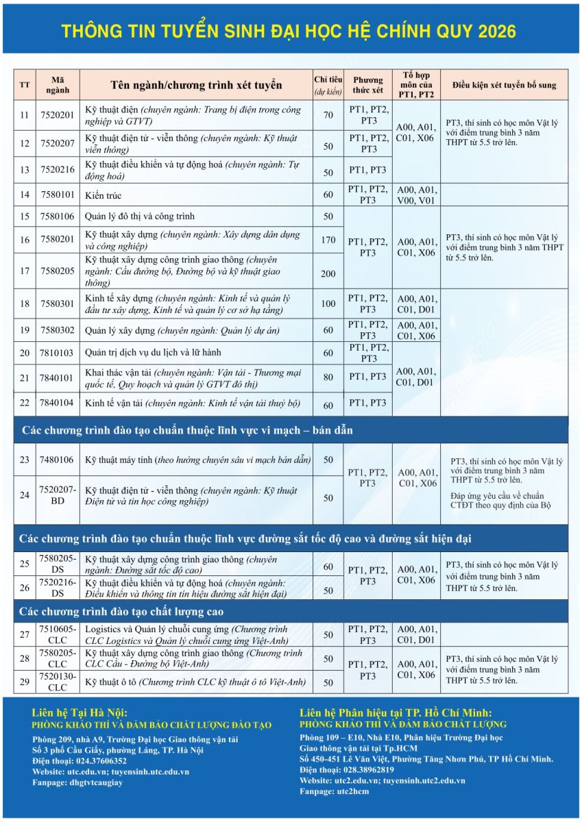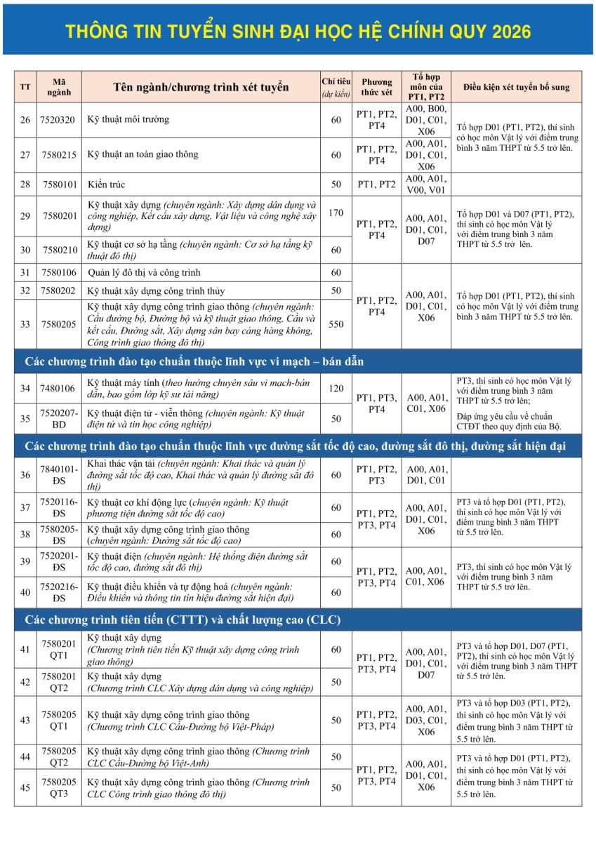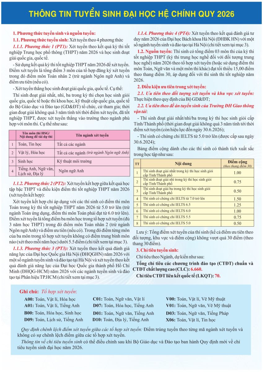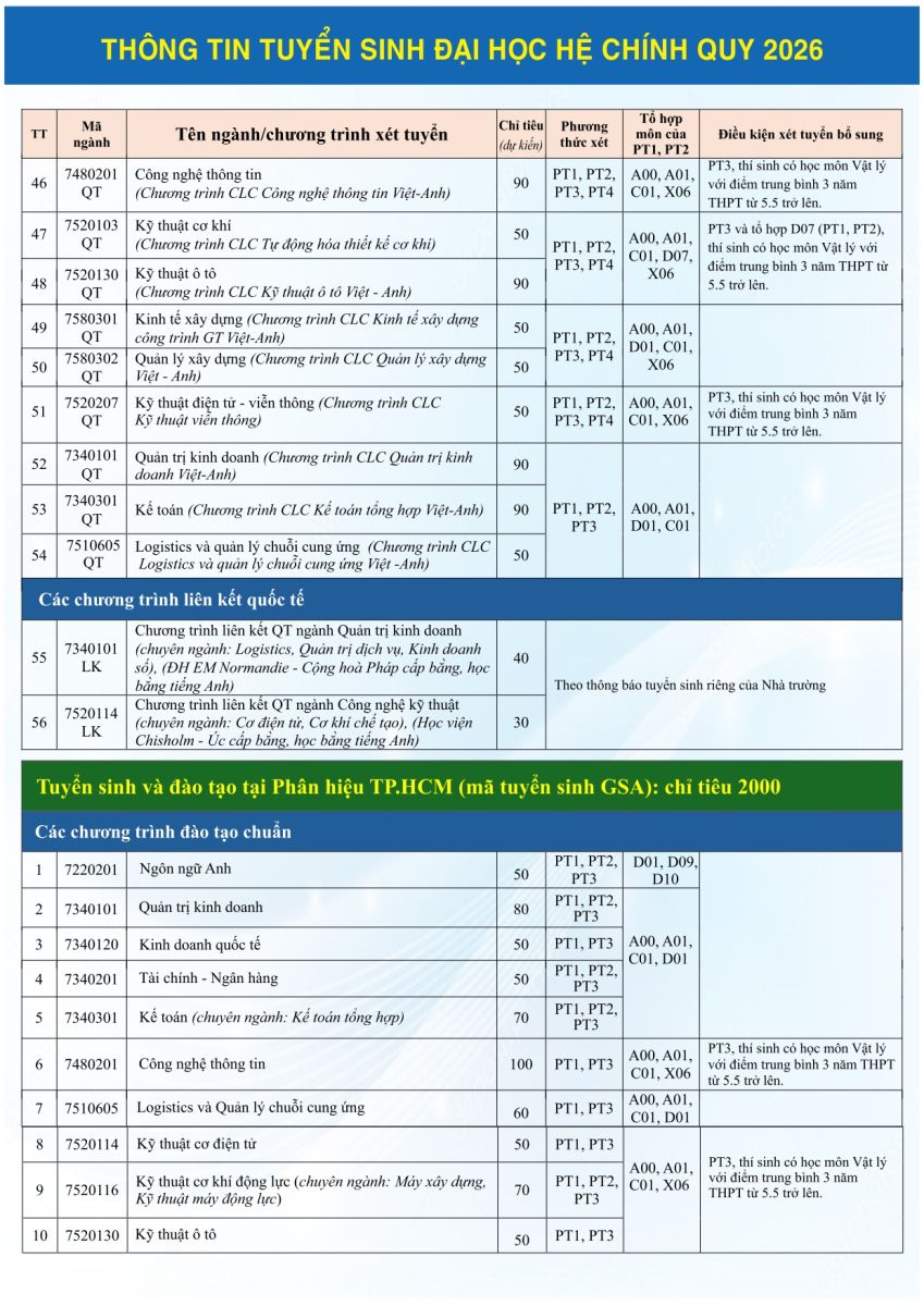THÔNG TIN TUYỂN SINH ĐẠI HỌC HỆ CHÍNH QUY 2026